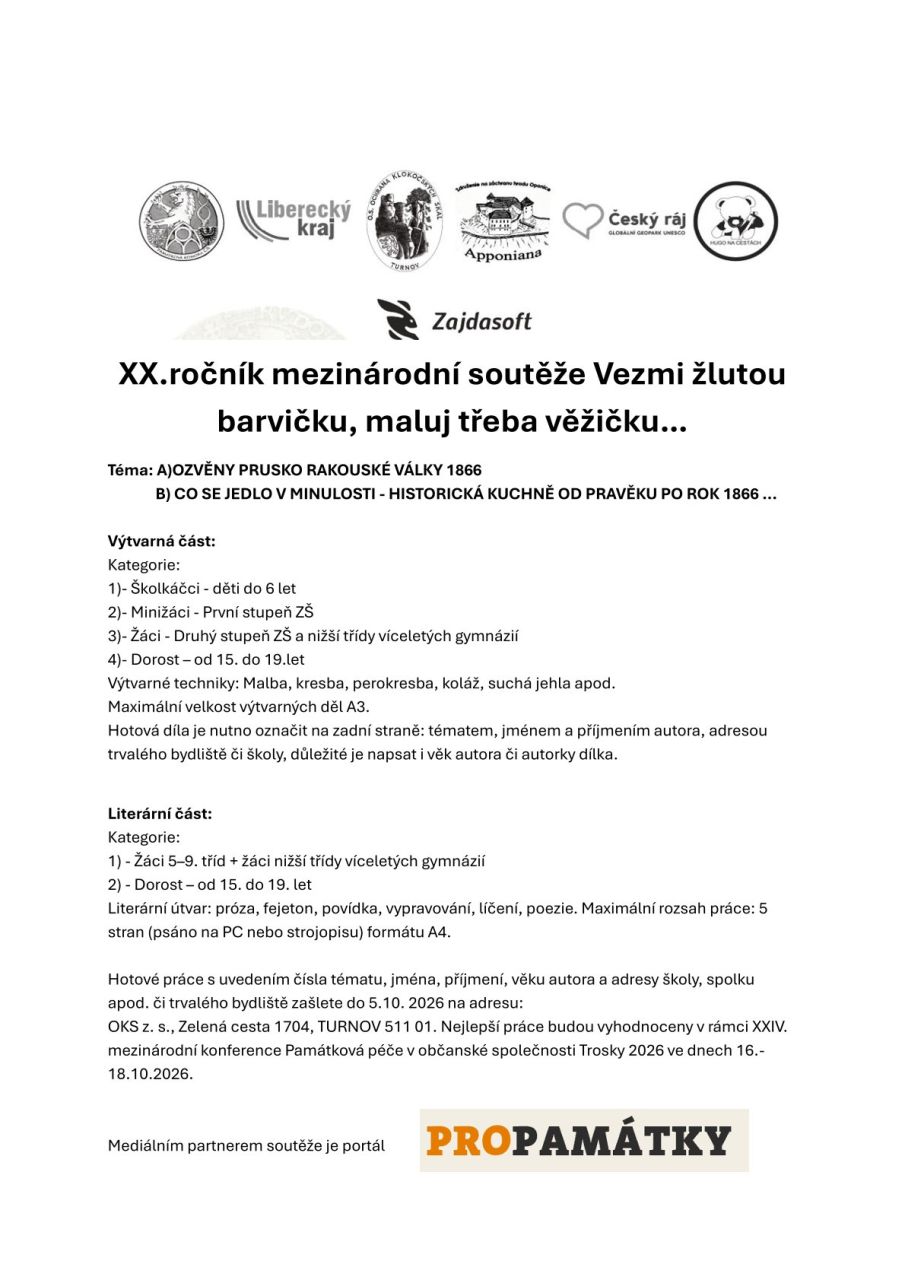 OKS z. s., Zelená cesta 1704, TURNOV 511 01. Nejlepší práce budou vyhodnoceny v rámci XXIV. mezinárodní konference Památková péče v občanské společnosti Trosky 2026 ve dnech 16.-18.10.2026.